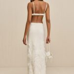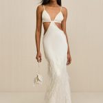 The Raisa Gown is artfully adorned with ostrich feather embroidery from the skirt cascading to the hem. The silky satin fabric is lined in polyester and drapes down from the bust in thoughtful cutouts that flatter the small of the waist. Thin shoulder straps reveal an open back. The rear strap is adjustable and the skirt sits on the hips.