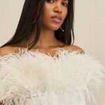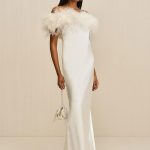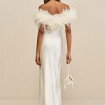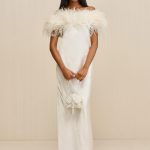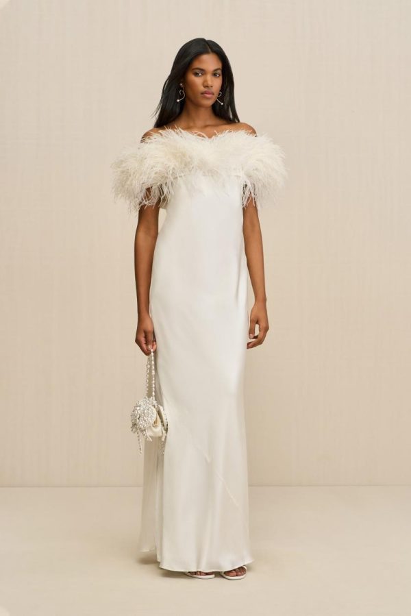 A bias cut long-sleeve silk gown with a halo of ostrich feathers across the bust.