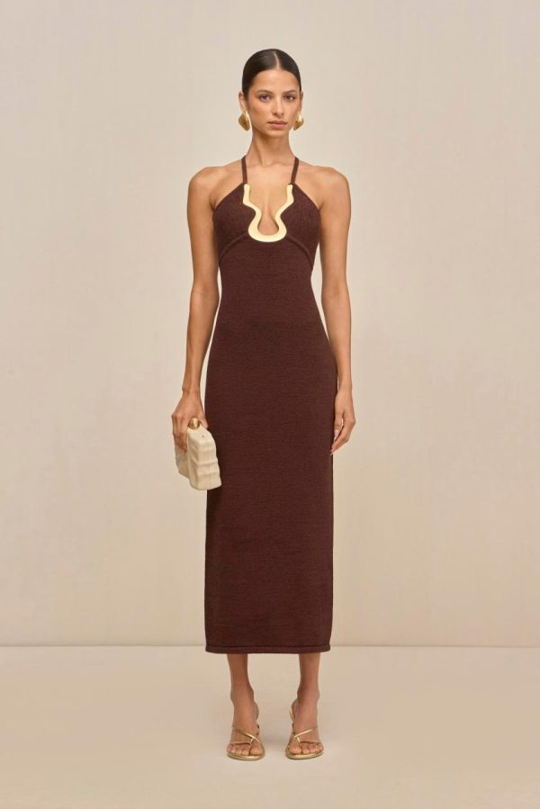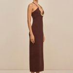 A body-con midi dress made in signature Cult Gaia tape yarn. This specialty hardware is a wearable work of art. This dress features an adjustable interior ribbon to hold the hardware close to the body.