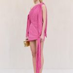 An asymmetrical, artfully draped plissé mini dress with tie details at the shoulders and left hip.