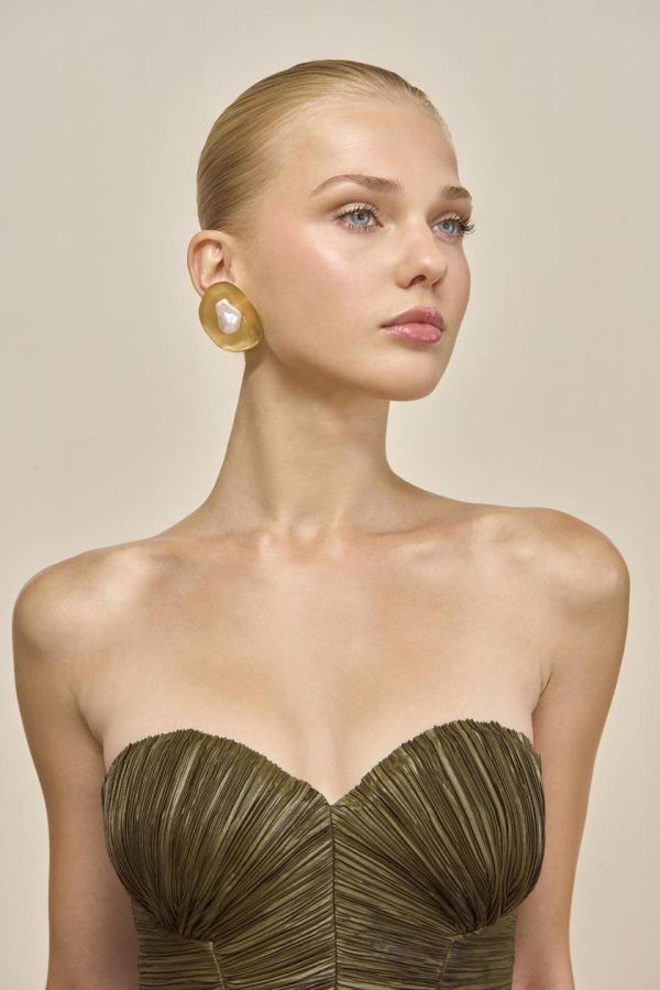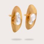 A pair of brushed brass earrings adorned with asymmetrical pearls.