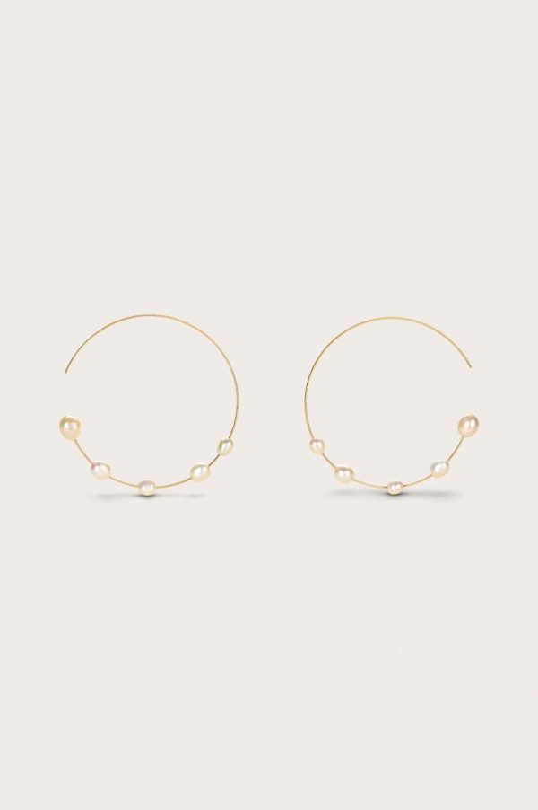 A thin gold brass oversized hoop earring with baroque pearls on bottom curve.