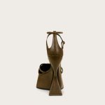 A sculptural leather platform heel with a wrapped ankle strap and a pointed toe.