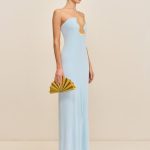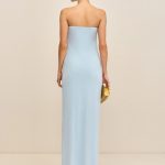 A strapless column gown with signature Cult Gaia gold hardware cutout at the front bust.