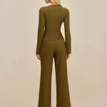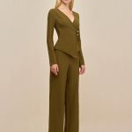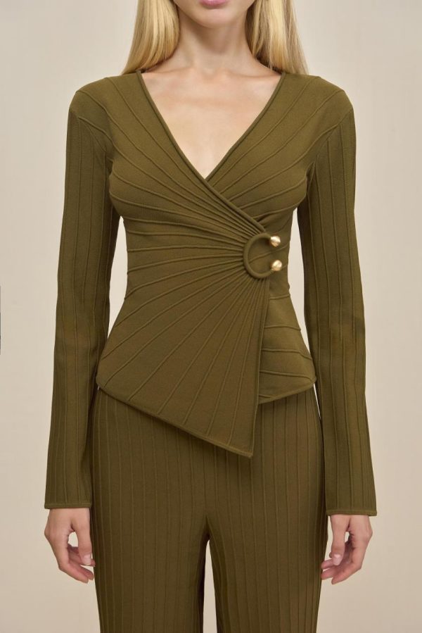 A long sleeve knit top with a fixed wrap front, accentuated by gold-toned hardware.