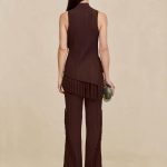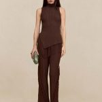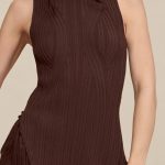 A ribbed knit top with a high mock neck and an asymmetrical hem adorned with elegant tassels.