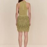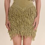 A statement mini skirt with a plunging waistline and all over gold knit fringe.
