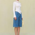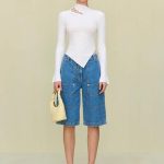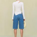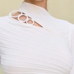 An asymmetrical long sleeve knit top with fabric covered rings and a mock neck.