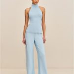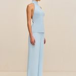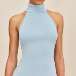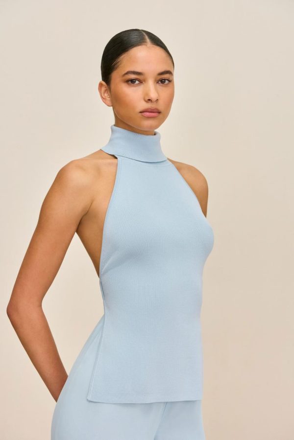 A high-neck, fully open-back halter top with wide back strap and narrow mock neckline.