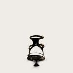 An easy sandal designed with a pedestal and slim ankle straps in shiny patent leather.