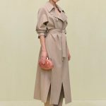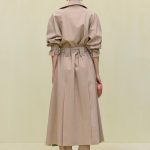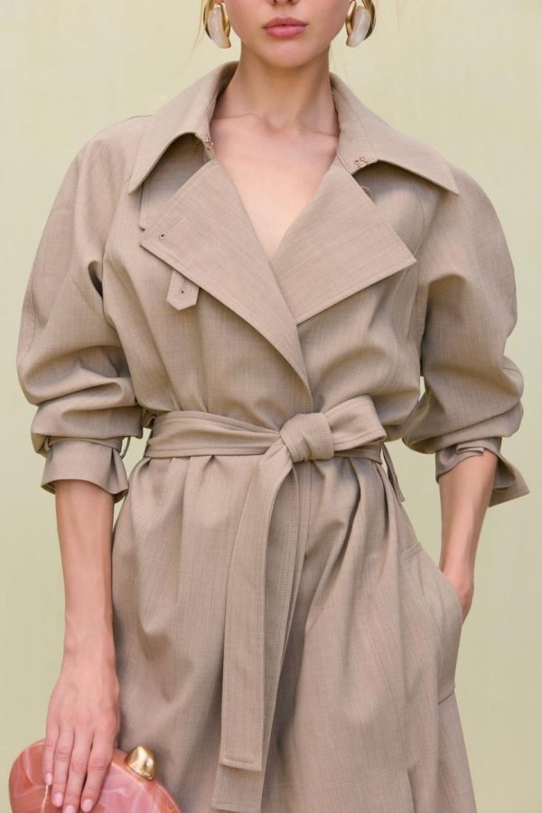 A lightweight wool trench coat with blouson sleeves and an adjustable waist tie.