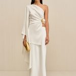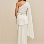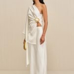 A breezy one-shoulder top that is gathered at the right side in a chunky knot adorned in a hammered, brushed-brass disk.