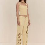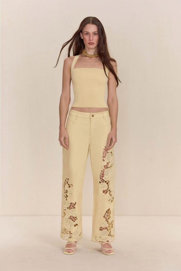 A mid-rise straight leg pant with a slight flare and thoughtfully placed lace inlet flower embroidery.