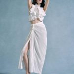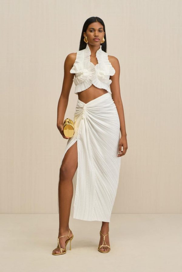 An ankle-length plissé skirt with an asymmetrical waistline and ruching at the high-hip.