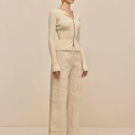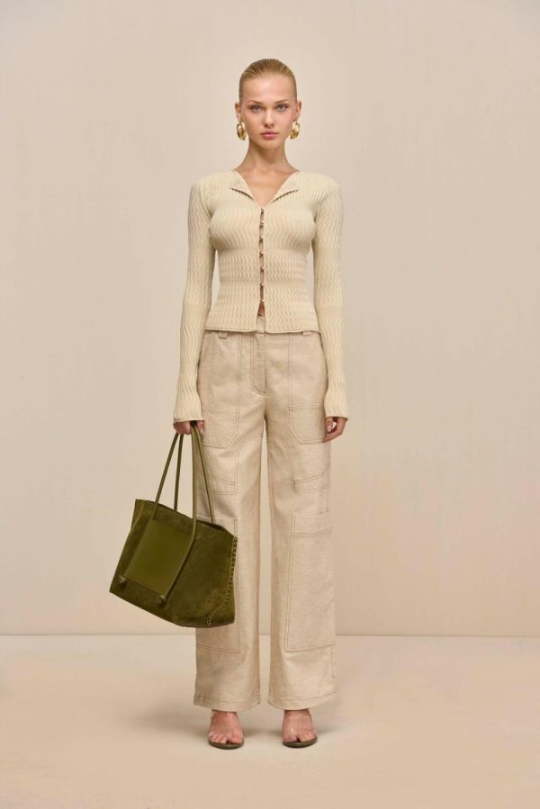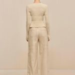 A linen blend cargo pant with functional pockets and optional drawstring ankles.