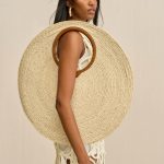 An oversized circular shoulder bag crafted out of raffia with a leather arm hole.