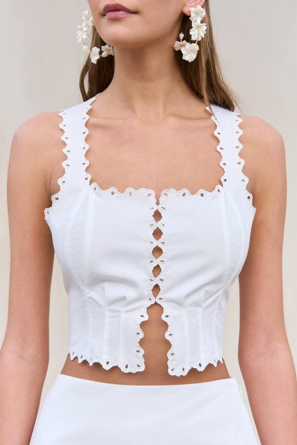 An ultra feminine cotton poplin blouse with eyelet details and a hook and eye front closure.