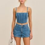 A cotton denim corset top with adjustable straps and signature Cult Gaia buckles.