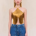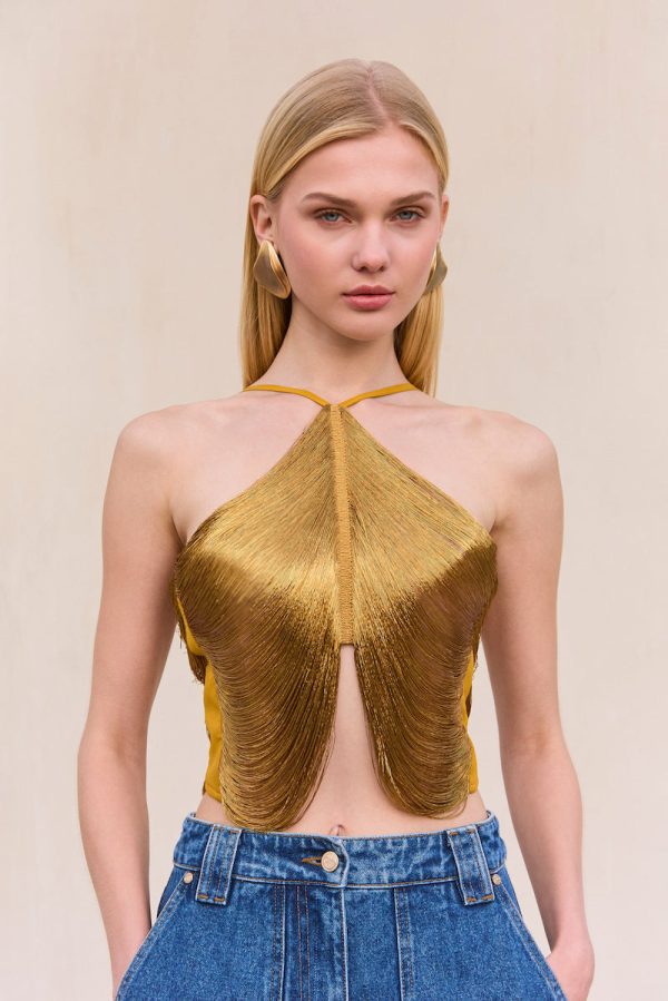 The Quella Top is simply stunning. A metallic gold fringe top features a halter neckline, open back and closes securely with a hook-and-eye. The open back is a deep v-cut connected at the shoulders and echoed by a slit in the back of the skirt. The layered and draped fringe skims the body reaching the waist creating luscious movement. Wear the Quella and plans and eyes will follow.