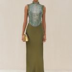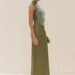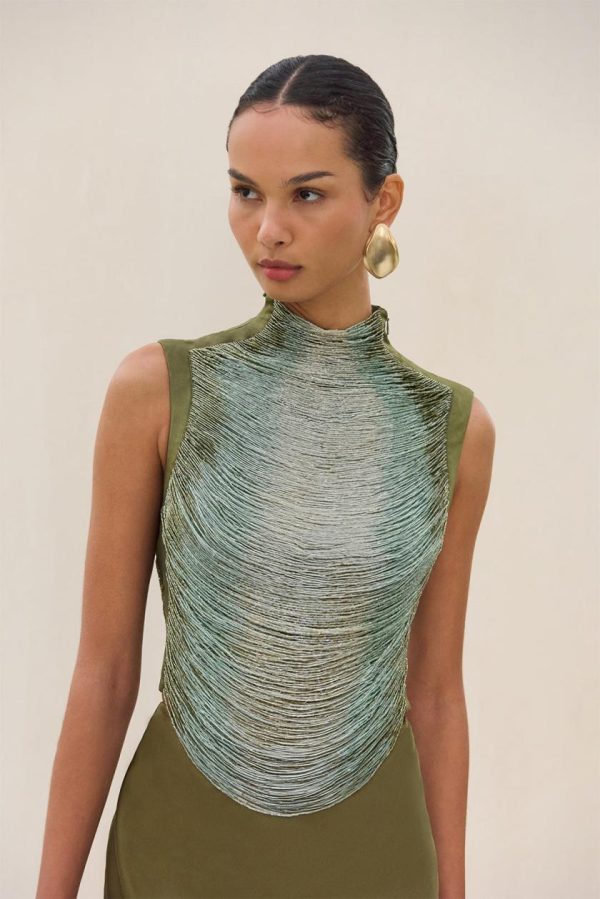An artisanal top rendered in hand beaded ombre arcs over a mesh underlayer.