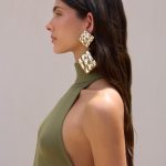 A high-neck, fully open-back halter top with wide back strap and narrow mock neckline.