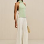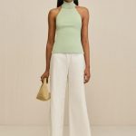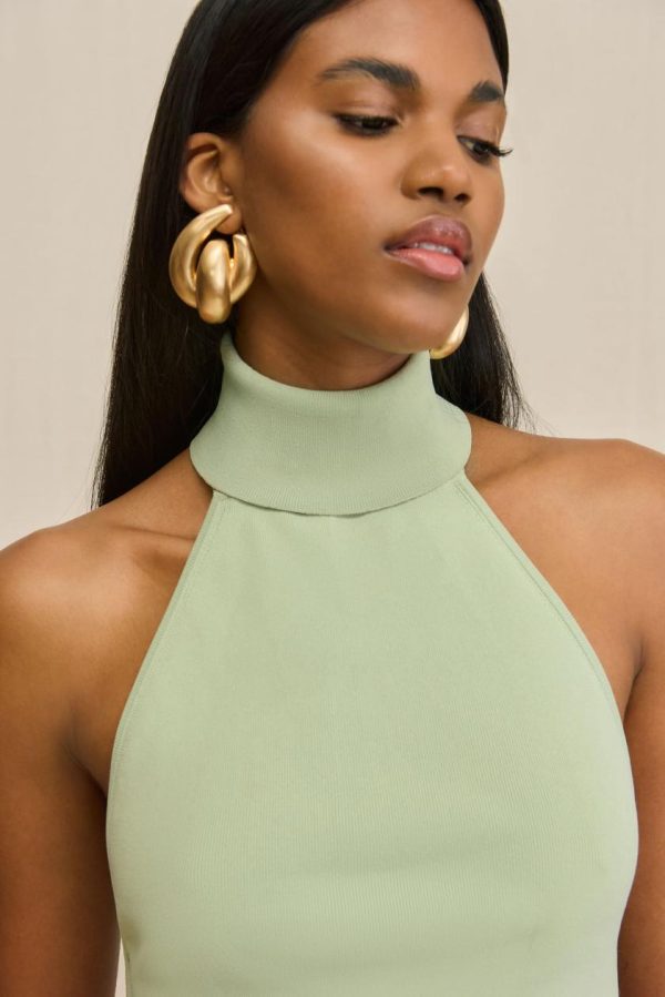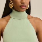 A high-neck, fully open-back halter top with wide back strap and narrow mock neckline.
