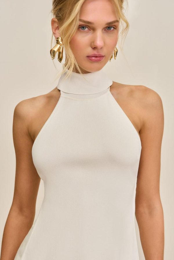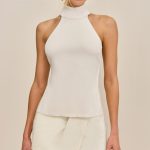 A high-neck, fully open-back halter top with wide back strap and narrow mock neckline.