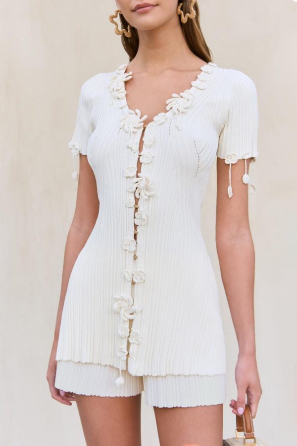 A ribbed knit cardigan top with crochet flowers and hook and eye closure.